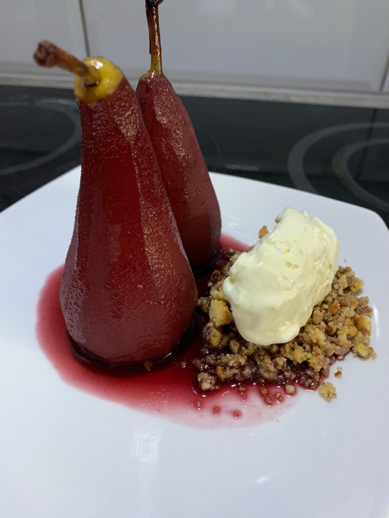 Overall this recipe is amazing. I implore you to try it if you’ve got a spare bottle of red wine sitting on your shelf, because you won’t be disappointed. The decadent sauce balances the sweet pears so well. With contrast provided from the cold ice cream, which helps to bring everything together. The biscuit crumb provides texture that is needed to counteract the heavy softness already on the plate. The dish is a winner. Perfect if you’re having a cosy night in on a cold winters evening or if you need a dessert to impress guests at a summer dinner party. Despite its simplicity, it’s a crowd pleaser that most would love to try! My rating is 5 stars!