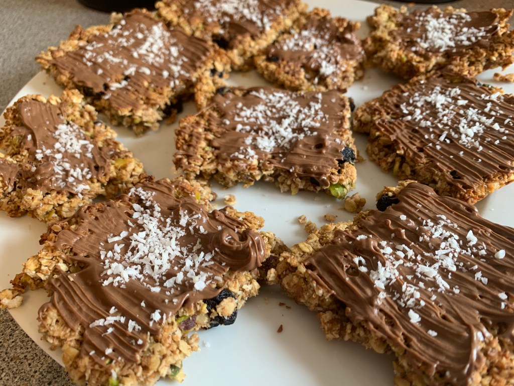 Crisp, crumbly and coated in chocolate. What’s not to like! I know what you’re thinking, it doesn’t immediately scream healthy, but there’s no added sugar and you don’t have to add too much chocolate to make an impact! The chocolate is definitely justified as the flavour is heavily influenced by it, and of course the maple provides some relief. The bars are very addictive and I didn’t feel as guilty going back for more! The recipe is quick, and easy and requires limited equipment. However in hindsight, I would have added more dried fruit and also more maple syrup or another substitute to help with the binding of the bars! A brilliant recipe but its not revolutionary and I find myself looking for more of a challenge in the kitchen, and so for that reason I give it 4 stars!
