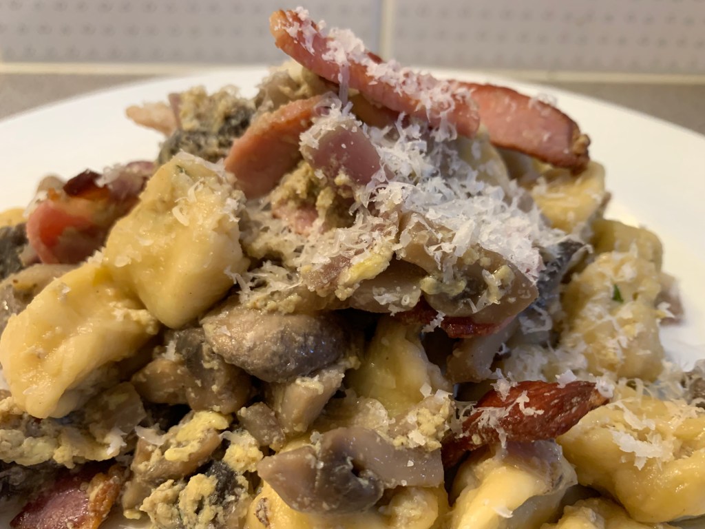 - Next time I would add in double cream to the egg and cheese sauce mixture before stirring into the bacon and mushrooms.