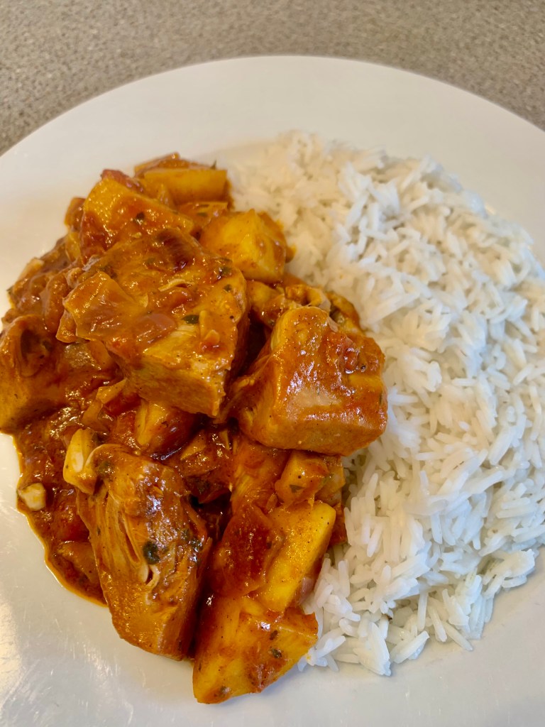 Overall this dish is a midweek hit! Simple, but still packs a punch! The sweetness of the jackfruit blends perfectly with the mellow heat of the curry. The potatoes providing substance, and the coconut milk gives the sauce a richness. Paired with rice, you can’t go wrong! There were mentions of cooking the potatoes for longer and cutting the jackfruit smaller, and perhaps adding in more herbs. Therefore, the rating of this recipe is 4 stars!