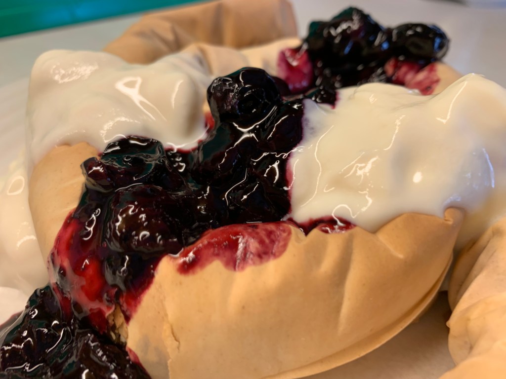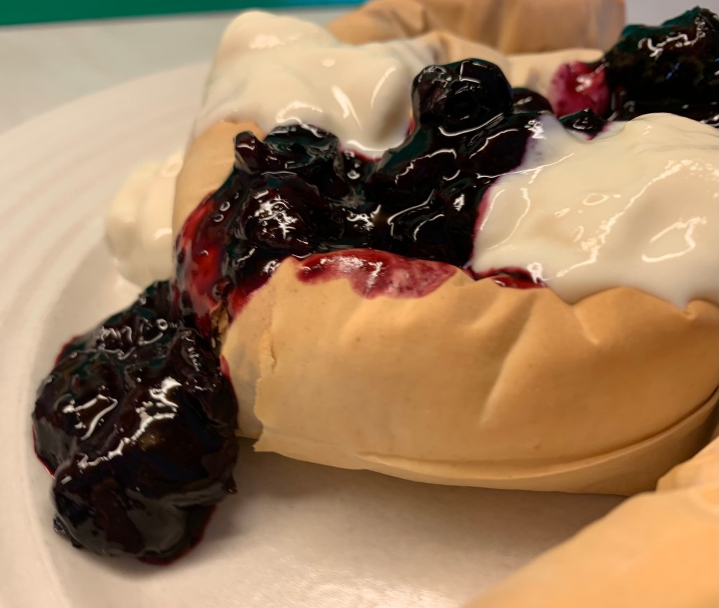 Overall, this dessert was very pleasant. It was filling and fun to do! The crisp filo pastry, the nuttiness of the peanut butter and walnuts and the sharp contrast of the blueberries all blended well together! However, it was very simple to do, and I would add other fruit to the blueberries to provide more sweetness to the sauce. I also think it needs some low-fat ice cream. The yogurt was nice, but if you go with it, I’d choose one with a prominent flavour like lemon to add further contrast to the dish rather than just natural yogurt. So I give it 3 stars!